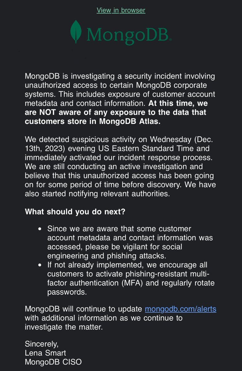 “MongoDB is actively investigating a security incident involving unauthorized access to certain MongoDB corporate systems, which includes exposure of customer account metadata and contact information. We detected suspicious activity on Wednesday (Dec. 13th, 2023) evening US Eastern Standard Time, immediately activated our incident response process, and believe that this unauthorized access has been going on for some period of time before discovery.” reads the alert published by the company.” At this time, we are not aware of any exposure to the data that customers store in MongoDB Atlas.”